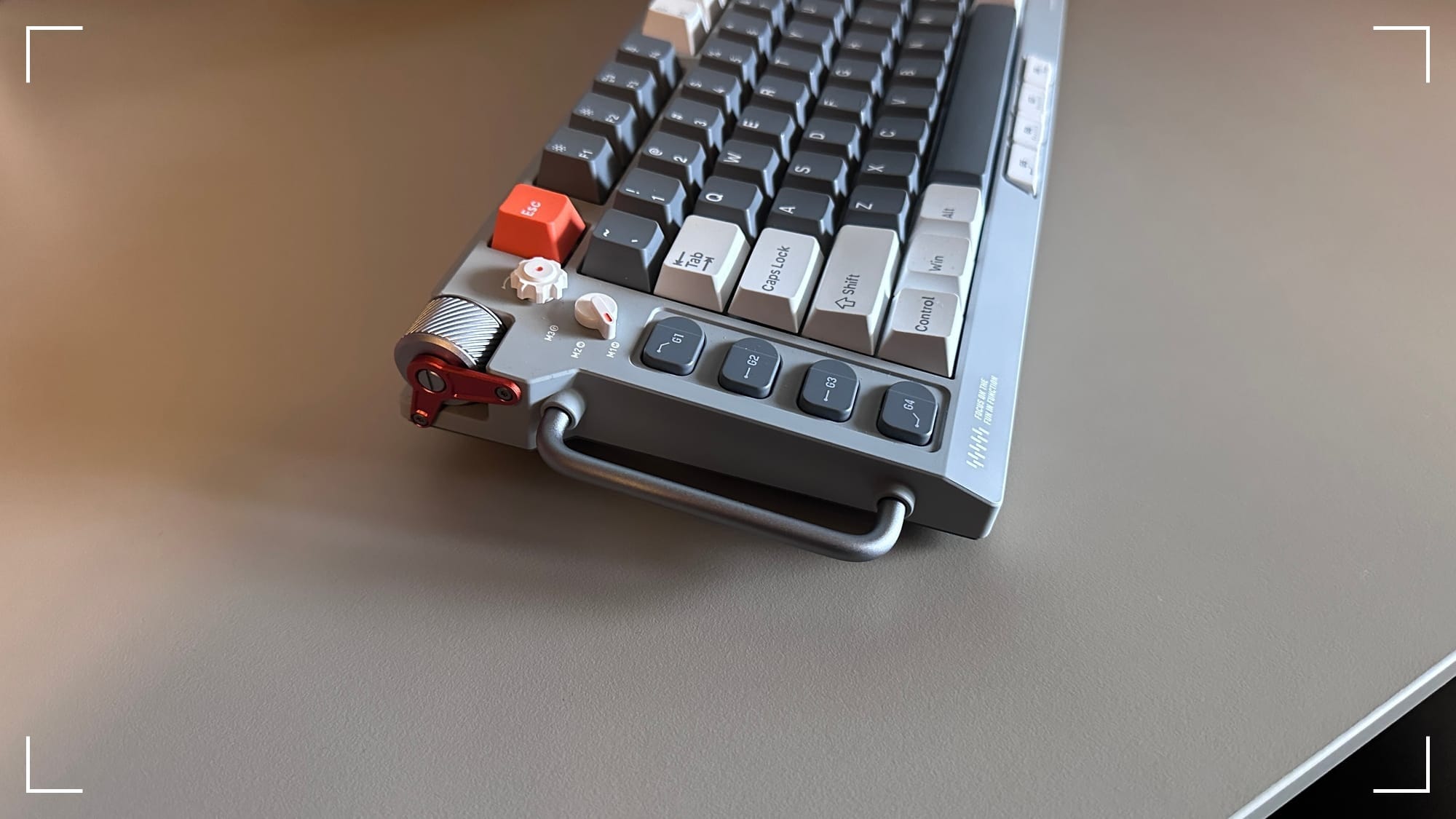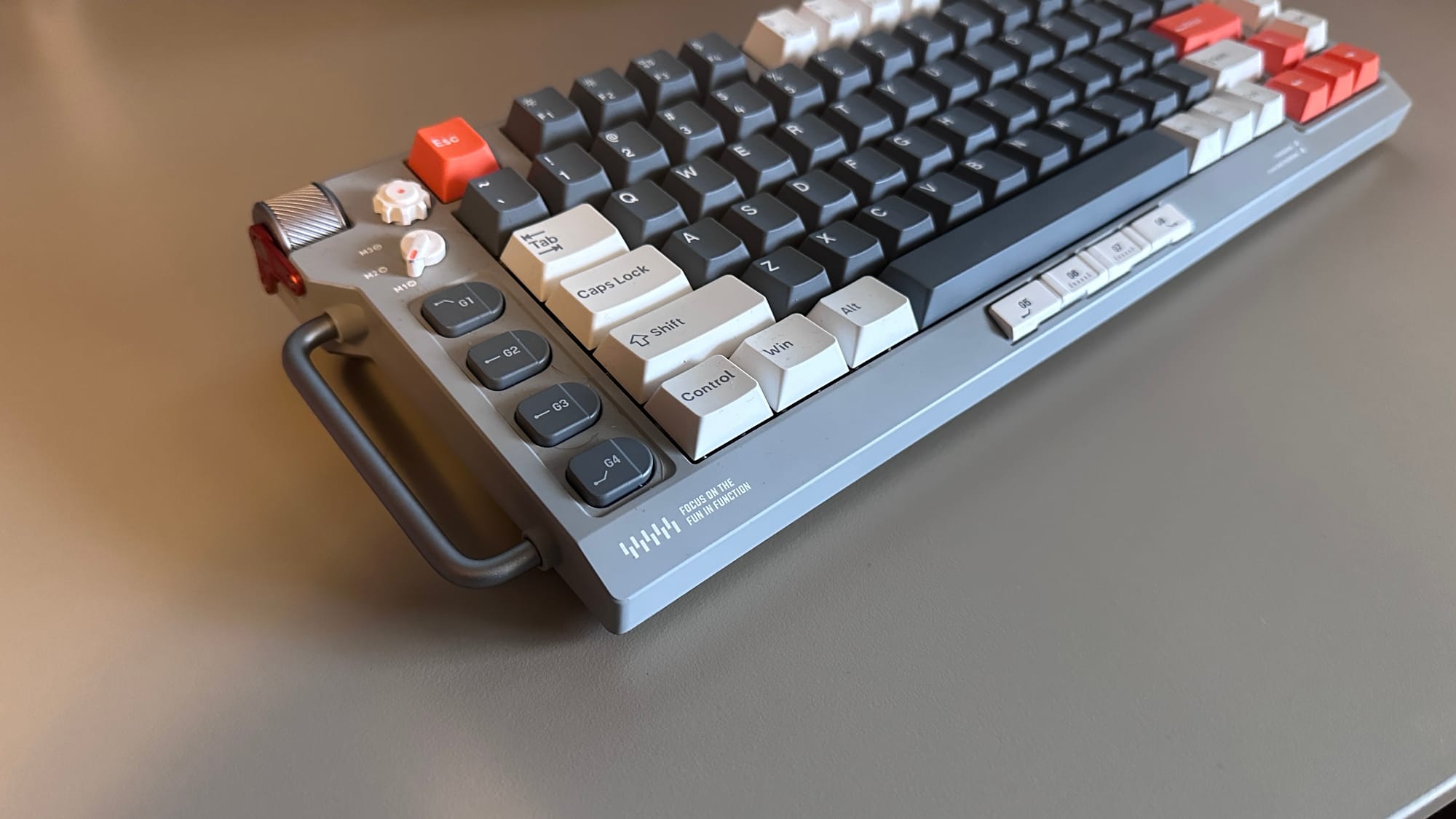 NuPhy placed eight macro keys across the Field75 HE, with four below the space bar and four on the left side of the keyboard. Above the left keys are two white knobs, and tucked away in the corner is a volume wheel.